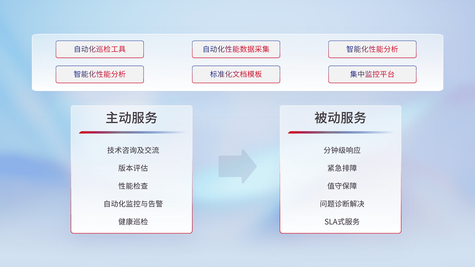 智能化工具和标准化文档,,,保障服务质量,,,提供主动服务(包含技术咨询、、、、版本评估、、、、性能检查、、、、自动化监控与告警、、、健康巡检)和被动服务包含(分钟级响应、、、紧急排障、、值守保障、、、、问题诊断解决、、SLA服务)。。。。